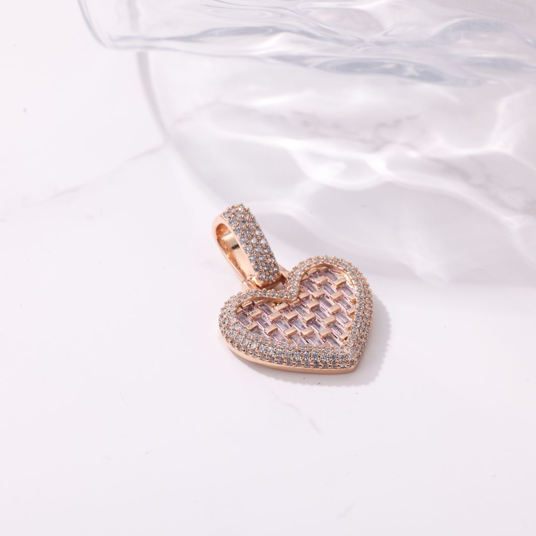 This Heart Pendant is a perfect choice for those who cherish romantic, sparkling jewelry. Crafted with a rose gold-plated finish, the heart-shaped pendant is adorned with dazzling cubic zirconia stones, featuring a central basket-weave design of baguette-cut CZs framed by a border of round-cut stones. Its warm hue and brilliant sparkle make it a timeless piece, ideal for adding a touch of love and sophistication to any ensemble.